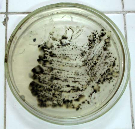 Hình 4:Nấm Cladosporum có sắc tố màu vàng nâu xen lẫn với nấm C. albicans được nuôi cấy từ bệnh phẩm |