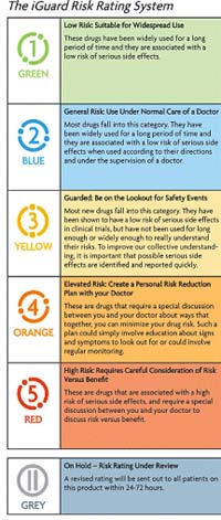 Hiện chưa có một thang điểm đánh giá một cách chính thống để đánh giá cho tất cả các loại thuốc, chỉ có hướng dẫn của hệ đánh giá nguy cơ thuốc theo thang 5 màu (iGuard Drug Risk Rating System) tương tự như hệ Homeland Security Advisory System: