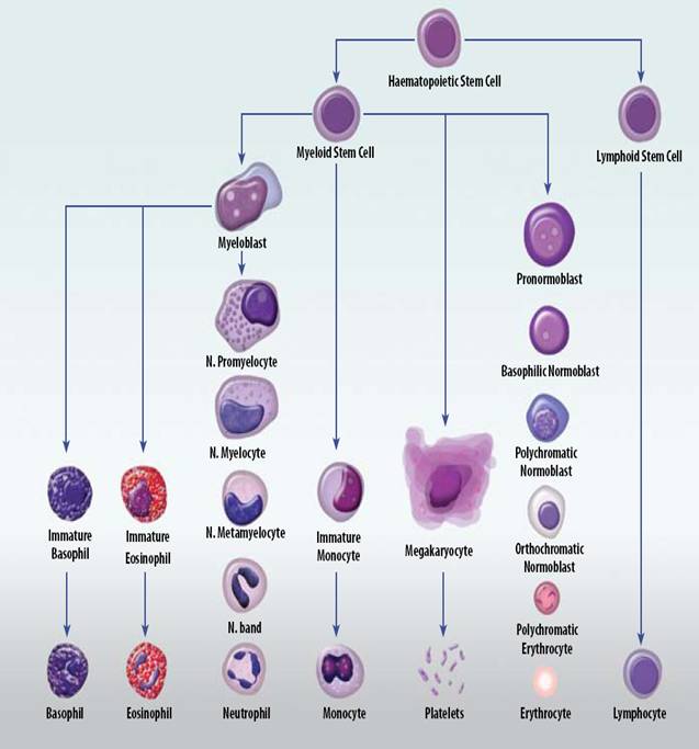 (i) Tỷ lệ các tế bào non, trung gian của từng dòng tế bào máu tăng, chứng tỏ dòng tế bào đó được tăng sinh theo yêu cầu của cơ thể. Ví dụ: các tế bào erythroblast kiềm, đa sắc, toan tăng cao trong các trường hợp thiếu máu;