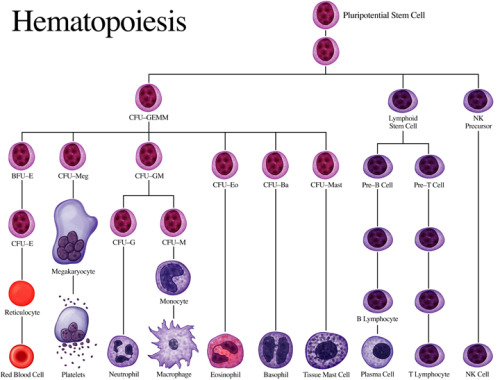 (v) Sự xuất hiện các tế bào non các dòng ở máu ngoại vi. Bình thường các tế bào non, nguyên bào và các tế bào trung gian chỉ có ở trong cơ quan tạo máu. Sự xuất hiện bất thường các tế bào này ở máu ngoại vi nói lên khả năng biệt hóa tế bào của tủy xương bị giảm sút hoặc ức chế nên có hiện tượng tăng cường quá mức các nguyên bào; cả trong tủy xương và tràn ra ngoài máu ngoại vi. Các tế bào non các dòng được phân chia, chuyển qua giai đoạn trung gian, rồi trưởng thành và được đưa vào máu ngoại vi thay thế cho các tế bào già hoặc vì lý do bệnh lý bị hủy.