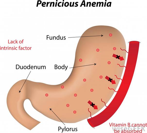 -Sự hấp thu vitamine B12 cần có chất nhày của niêm mạc dạ dày (gastromucoproteine_GMP) để bảo vệ vitamine B12 tránh bị hủy hoại bởi các men tiêu hóa. Vitamine B12 từ thức ăn vào dạ dày kết hợp với GMP tạo thành phức hợp vitamine B12 (còn gọi là yếu tố chống thiếu máu), được dự trữ ở gan, có tác dụng kích thích tủy xương tạo HC và trưởng thành theo nhu cầu cơ thể.