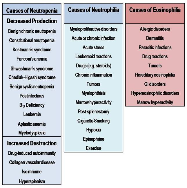 -Nhiễm độc: nhiều chất độc lý, hóa, sinh vật khác nhau có tác dụng với số lượng BC như tia phóng xạ liều nhỏ kích thích, một số chất như asen, benzen, pyramidon, sulfamid, chlorocid có thể làm giảm BC và ức chế tủy xương. BC có thể hủy dưới ảnh hưởng của kháng thể kháng BC được tạo thành khi truyền máu nhiều lần, hoặc khi bị dị ứng với thuốc, hóa chất;