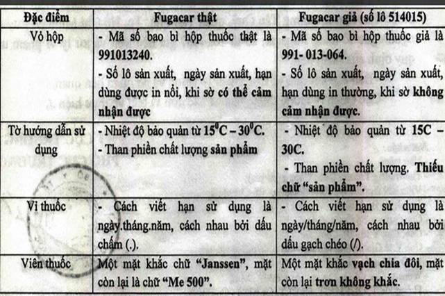 Thuốc Fugaca thật - giả (số lô 1614007) có các đặc điểm: