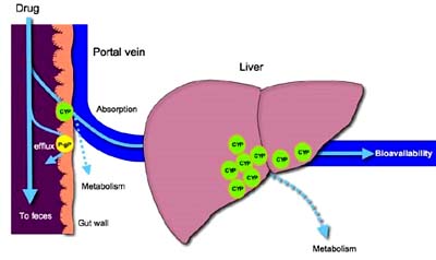 Khi lưu lượng máu đến dạ dày và ruột non được tăng lên thì chuyển hoá thuốc cũng nhanh hơn bình thường, trong tương tác này còn có liên quan đến lưu lượng máu qua gan;