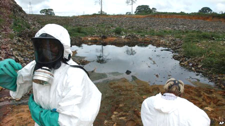 | Các chuyên gia loại bỏ chất thải làm việc để loại bỏ bùn đen nguy hiểm từ một bãi rác ở Abidjan, Bờ Biển Ngà. |