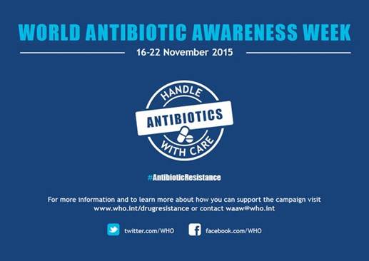 Ngày 16-22/11/2015. Tổ chức Y tế thế giới (WHO) cho biết “Tuần lễ nhận thức về thuốc kháng sinh thế giới” (World Antibiotic Awareness Week) nhằm tăng cường nhận thức kháng thuốc kháng sinh và khuyến khích thực hành tốt nhất trong cộng đồng, nhân viên y tế cũng như các nhà hoạch định chính sách để tránh tình trạng khẩn cấp và kháng thuốc đang lan rộng.