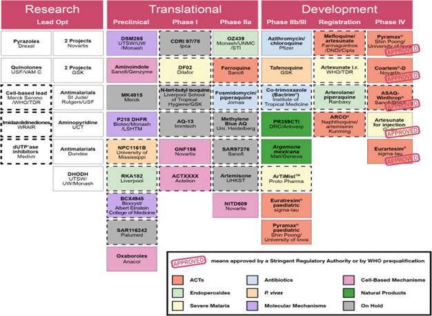 58.Olliaro P, Wells TN. The global portfolio of new antimalarial medicines under development. Clin Pharmacol Ther. 2009 !important; 85:584–595. [PubMed: 19404247] This article provides a comprehensive review of new antimalarials in the clinical and preclinical phases of development and their potential impact on malaria control and elimination.