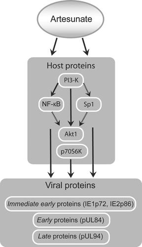 Sự nhân lên của CMV được điều hoà chặt chẽ với những con đường hoạt hoá tế bào qua trung gian bằng sự tác động qua lại trực tiếp hoặc gián tiếp với yếu tố gắn liền DNA của virus, như NF-κB và Sp1. Các yếu tố này cung cấp các yếu tố quyết định chính của sự tác động qua lại tế bào vật chủ - virus. Đối với cả NF-κB và Sp1, một sự giảm tổng hợp protein được gây cảm ứng CMV và một sự giảm trong sự hoạt hoá NF-κB và Sp1 gắn liền với DNA được nhìn thấy khi điều trị bằng artesunate. Sự hoạt hoá ức chế hướng đến NF-κB không đặc hiệu đối với đơn thuần Artesunate; nó cũng được biểu thị đối với các sesquiterpene lactones khác. Hiệu quả của sự nhân lên CMV được gắn liền gần gũi với các con đường hoạt hoá NF-κB và Sp1 và các yếu tố liên quan khác, như kinase phosphoinositol 3–kinase phát tín hiệu tế bào. Phosphoinositol 3–kinase được yêu cầu đối với hoạt hoá của NF-κB và Sp1 trong các nguyên bào sợi bị nhiễm. Một cách thú vị, các yếu tố tác dụng xuôi dòng của phosphoryl hoá đối với phosphoinositol 3–kinase, như protein kinases Akt và p70S6K, cũng bị Artesunate ức chế. Ngoài ra, nhiều hợp chất giao thoa với các con đường hoạt hoá của các yếu tố sao chép tế bào như con đường tín hiệu truyền gồm protein kinase p38 hoạt hoá bào phân, ức chế sự nhân lên của CMV. Điều đáng lưu ý rằng là chất tăng cường chất hoạt hoá sớm qua trung gian CMV (CMV immediate-early promoter enhancer) (bên cạnh các chất hoạt hoá virus khác) chứa các vị trí gắn cho cả Sp1 lẫn NF-κB và, vì vậy, nó chịu trách nhiệm đối với cả 2 yếu tố. Sự giảm biểu thị của IE2p86 làm hạn chế một cách quan trọng sự nhân lên của virus, vì IE2p86 là cơ bản đối với những bước điều hoà kế tiếp của sự khởi đầu. Mặt khác, NF-κB là yếu tố chính trong những con đường bảo vệ tế bào (ví dụ, Các tác dụng kháng virus được gây cảm ứng bởi IFN type 1) và cũng có thể tác động âm tính trên sự sản sinh virus và quá trình nhiễm virus. Vì vậy, những con đường hoạt hoá mà liên quan đến Sp1 và NF-κB là những yếu tố quan trọng trong việc khởi phát ban đầu của chu kỳ nhân lên của virus, cũng như những bước muộn trong sự tác động qua lại virus-tế bào vật chủ, vì vậy quan trọng đối với tác dụng kháng virus của Artesunate.