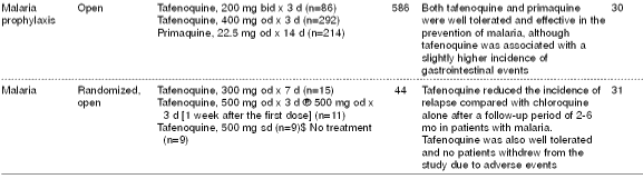 2.Lell B, Faucher JF, Missinou MA, et al. (2000). "Malaria chemoprophylaxis with tafenoquine: a randomised study.". Lancet 355 (9220): 2041–5.