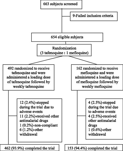 Đây là một nghiên cứu do nhóm tác giả Peter E. Nasveld, Michael D. Edstein, Mark Reid, Leonard Brennan, Ivor E. Harris, Scott J. Kitchener, Peter A. Leggat, Philip Pickford, Caron Kerr, Colin Ohrt, William Prescott đăng tải trên Antimicrobial Agents and Chemotherapy, February 2010, p. 792-798, Vol. 54, No. 2 . Đây là một nghiên cứu phase III đánh giá độ an toàn, tính dung nạp và hiệu quả của Tafenoquine trong dự phòng sốt rét.
