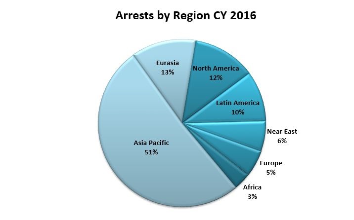 • Theo tỷ lệ phần trăm, khu vực Châu Á Thái Bình Dương có số vụ bị bắt giữ nhiều nhất