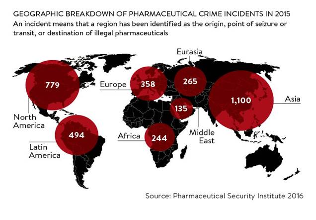 Trong số 1.510 báo cáo CIS xác định liên quan đến thuốc giả, có 27,6% báo cáo Trung Quốc như một quốc gia nguồn phát hiện có liên quan. Ngoài ra, 51,3% báo cáo thuốc giả nhưng phân loại phụ thuốc giả đặc biệt không biết hoặc có thể xác minh được. Phân loại các thuốc điều trị chống nhiễm trùng chiếm nhiều nhất (21,1%) với hầu hết các báo cáo có nguồn gốc từ cơ sở nhà nước liên quan y tế. Về mặt địa lý, các vùng châu Mỹ Latin và châu Á và về mặt kinh tế, các thị trường có thu nhập trung bình biểu hiện vấn đề nhiều nhất. Tổng số 127 (64,8%) trong số 196 quốc gia không có dây chuyền cung cấp chính thống báo cáo thuốc giả CIS. Cải thiện giám sát, gồm cả việc phát hiên, an ninh, thu thập dữ liệu, phân tích và ấn bản thông tin là cần và cấp thiết thoe nhu cầu của y tế công cộng để chống lại kinh doanh thượng mại thuốc giả trên toàn cầu.