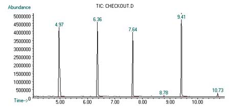 Trong khi các thiết bị chạy, máy sẽ đưa ra các biểu đồ từ các tín hiệu như hình 1. Đây gọi là sắc đồ, mỗi một peak trong sắc đồ sẽ miêu tả một tín hiệu tạo nên khi chất giải hấp từ cột sắc ký và đi vào đầu dò detector, trục hoành biểu diễn thời gian lưu và trục tung biểu diễn cường độ của tín hiệu, trong hình 1 mỗi đỉnh (peak) biểu diễn một chất riêng lẻ, chất này được tách từ hỗn hợp mẫu phân tích, peak có thời gian lưu (TR) 4,97 phút là dodecane, 6.36 phút là biphenyl, 7.64 phút là chlolobiphenyl, 9.41 phút là hexadecanoic acid methyl ester.