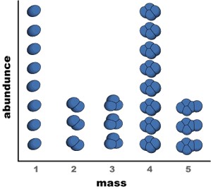 Trên hình ta thấy phân tử ban đầu có khối lượng là 5. Trên sơ đồ khối phổ hạt lớn nhất này được gọi là ion phân tử (molecular ion). Các hạt nhỏ hơn có khối lượng 1,2,3 và 4 được gọi là các ion phân mảnh (fragment ions). Trong trường hợp ví dụ trên ta thấy các phân tử của chất này có xu hướng bị phá vỡ thành các tổ hợp 1-4 hơn là 2-3.