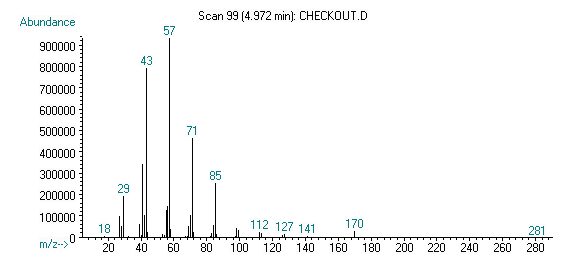 Trong hình 2, hình ảnh khối cao nhất là dodecane, phần nềm của GC/MS nó giống như là một thư viện hình ảnh dùng để nhận ra các chất chưa biết tồn tại trong hỗn hợp mẫu. Thư viện này có thể so sánh hình ảnh khối từ thành phần của mẫu với hình ảnh khối trong thư viện của máy.