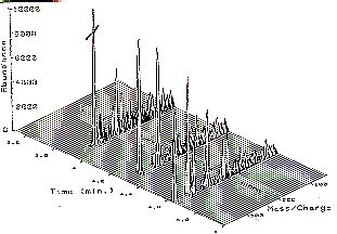 Máy tính sẽ ghi lại các biểu đồ của mỗi lần quét. Trục hoành biểu diễn tỉ lệ M/Z còn trục tung biểu diễn cường độ tín hiệu của mỗi mảnh vụn được quét bởi đầu dò detector. Đây là đồ thị của số khối. Làm thế nào để phân tích các kết quả từ máy tính? Dưới đây là một hình khối phổ. Trục X là khối lượng còn trục Y là số lượng. Mỗi hóa chất chỉ tạo ra một mô hình duy nhất, nói cách khác mỗi chất có một “dấu vân tay” để nhận dạng, dựa trên mô hình ion của nó.