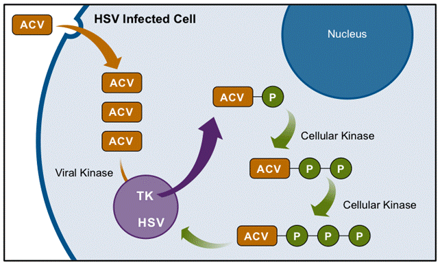 Acyclovir là một thuốc chống virut (nên chỉ dùng trong các trường hợp nhiễm virut, không dùng cho các bệnh nhiễm khuẩn). Thuốc được dùng trong các trường hợp: nhiễm virut Herpes simplex týp 1 và 2 ở da và niêm mạc, viêm não do Herpes simplex virus, điều trị bệnh zona, Herpes sinh dục, bệnh thủy đậu. Khi điều trị bằng acyclovir phải được bắt đầu càng sớm càng tốt khi có dấu hiệu triệu chứng của bệnh. Thức ăn không làm ảnh hưởng đến hấp thu của thuốc nên có thể uống thuốc không phụ thuộc vào bữa ăn.