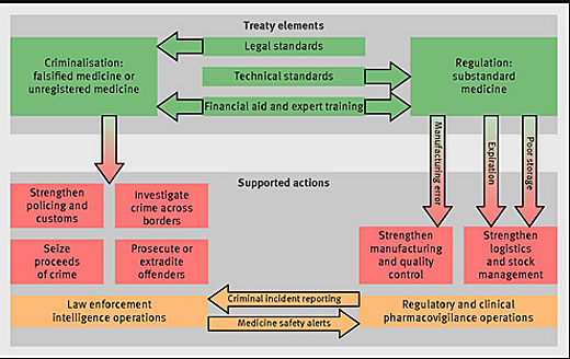 Các quy định được xây dựng nhằm chuyển tội danh làm thuốc giả từ vi phạm bản quyền sang tội hình sự. Khi cảnh sát, giới khoa học, và các chuyên gia y tế tổ chức một cuộc điều tra về nạn thuốc giả ở Đông Nam Á, họ đã bị sốc khi nhận ra gần một nửa số thuốc chống sốt rét mà họ thu được là giả. Đáng lo ngại hơn nữa khi người ta khám phá ra là rất nhiều vỉ thuốc bỏng, lẽ ra có chức năng cứu người khi nguy cấp, nhưng lại chứa những viên thuốc có tinh dầu xá xị (safrole), một hợp chất gây ung thư, thường được dùng để chế ma túy tổng hợp. Sự có mặt của thành phần safrole trong thuốc bỏng càng cho thấy sự liên quan giữa những tổ chức sản xuất thuốc giả và các nhóm tội phạm. Hiện đang có một khoảng xám trên phương diện pháp lý, cho phép những kẻ làm thuốc giả hưởng lợi nhuận rất cao trong điều kiện tương đối ít rủi ro.