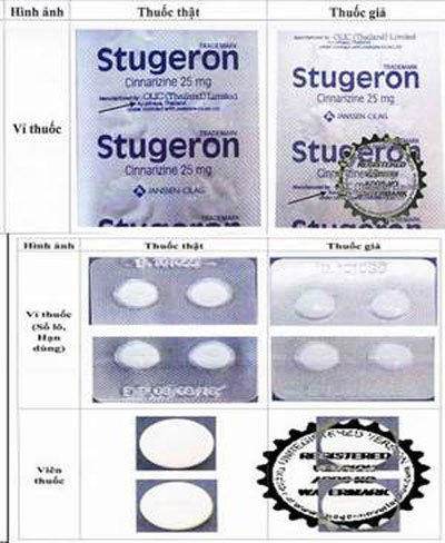 Tại thị trường Hà Nội và Hải Phòng, cơ quan chức năng cũng phát hiện thuốc stugeron dùng phòng ngừa say sóng, say tàu xe, máy bay, phòng ngừa và điều trị đau nửa đầu, điều trị duy trì các triệu chứng có nguồn gốc tuần hoàn não... trong đó có lô thuốc số B.101039 bị làm giả