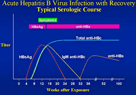 Sau khi HBV nhập vào cơ thể, hệ miễn nhiễm sẽ tạo kháng thể cho từng kháng nguyên của HBV (xem hình). Một tuần hay một tháng sau khi nhiễm siêu vi trùng, HBsAg xuất hiện trong máu, tiếp theo là HBeAg và kháng thể IgM và IgG cho HBcAg (anti-HBc). Khi HBsAg biến mất, thì kháng thể chống sAg (anti-HBs) mới xuất hiện. Một khi anti-HBs xuất hiện người bệnh được coi như hồi phục, trở thành miễn nhiễm đối với HBV và không lây bệnh qua người khác được. Một số bệnh nhân không tạo được kháng thể này và tiếp tục mang mầm bệnh HBsAg, sẽ có thể lây cho người khác. Kháng thể anti-HBc có hai loại: IgM trong thời kỳ bị nhiễm trùng cấp tính và IgG trong thời kỳ chuyển tiếp. Nếu anti-HBc IgG không hạ xuống và có HBsAg có nghĩa bệnh nhân đang bị dạng viên gan mạn tính. Nếu HBeAg dương tính là dấu hiệu cho thấy virus đang nhân lên mạnh mẽ, bệnh nhân có khả năng lây cao, trường hợp này cần điều trị. Khi thử nghiệm thấy anti-HBe thì có tiên lượng tốt hơn và khả năng lây không nhiều. Hiện nay, có xu hướng căn cứ vào định lượng HBV DNA để làm căn cứ điều trị, tuy nhiên điều này chưa được hoàn toàn khẳng định.