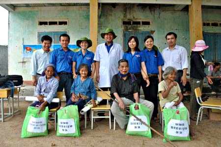 -Tặng quà bằng hiện vật như: gạo, đường, sữa, dầu ăn, quần áo củ cho hộ nghèo và các cụ già neo đơn các em nhỏ có hoàn cảnh đặc biệt…tại địa phương