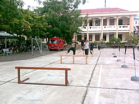 - Thi chạy 100m lách qua cọc lửa dùng bình chữa cháy (MFZ4) dập tắt khay xăng.