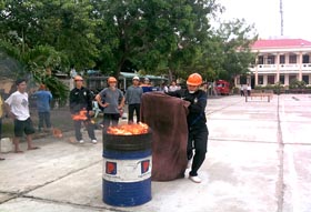 - Thi phối hợp dùng chăn ướt dập tắt đám cháy phuy xăng, kết hợp di chuyển tài sản chống cháy lan.