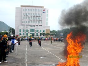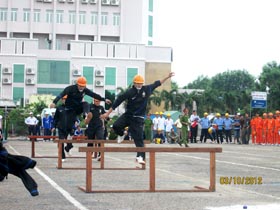 - Thi chạy 100m lách qua cọc lửa dùng bình chữa cháy (MFZ4) dập tắt khay xăng, kết hợp di chuyển tài sản chống cháy lan.