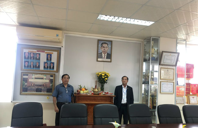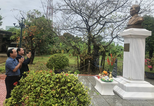 PGS.TS Nguyễn Văn Chương-Nguyên Viện trưởng và PGS.TS Hồ Văn Hoàng-Viện trưởng dâng hương trước Tượng đài của Thầy-Cố Giáo sư, Bác sĩ - Anh hùng Liệt sĩ Đặng Văn Ngữ