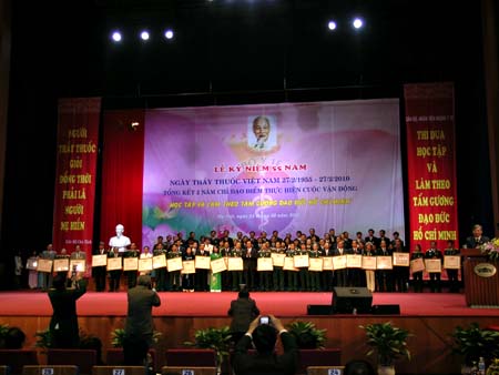 Sau diễn văn lễ kỷ niệm của Bộ trưởng Bộ Y tế, TS. Trần Đức Long, Vụ trưởng Vụ pháp chế, Bộ Y tế lên đọc quyết định phong tặngDanh hiệu Thầy thuốc Nhân dân và Thầy thuốc Ưu tú lần thứ 9; khen thưởng tập thể và cá nhân có thành tích thi đua xuất sắc năm 2009. Thay mặt lãnh đạo Đảng, Nhà nước và Chính phủ, Thủ tướng Chính phủ Nguyễn Tấn Dũng đã trao tặng danh hiệu Thầy thuốc Nhân dân cho 73 cán bộ ngành Y tế, cờ thi đua xuất sắc năm 2009 cho 11 đơn vị y tế và một số Bằng khen của Bộ Y tế cho một số cá nhân và tập thể trong cả nước. Trong đợt phong tặng này có 1233 Thầy thuốc ưu tú trong cả nước được uỷ nhiệm cho các đơn vị trao tại cơ sở.