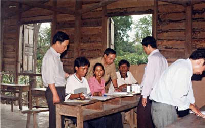 TS.Nguyễn Văn Chương-Phó Viện trưởng Viện số rét-KST-CT Quy Nhơn(áo nâu) kiểm tra số sách về tình hình nhiễm sán lá gan ở địa phương trong một đợt công tác tại thực địa |