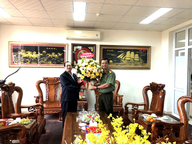 Đồng chí Châu Văn Quang, Phó Trưởng Công an TP Quy Nhơn tặng hoa chúc mừng đến Viện nhân Ngày Thầy thuốc Việt Nam 27/2