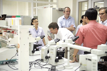 | Lãnh đạo Viện làm việc với đại diện Trường Đại học Quy Nhơn, Trường Đại học Paris 7 (Pháp) và trường Đại học Y Dược TP. Hồ Chí Minh. |