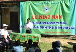Khai mạc buổi lễ, được sự chỉ đạo và phân công của PGS.TS Triệu Nguyên Trung Viện trưởng Viện Sốt rét-KST-CT Quy Nhơn, ThS. Hồ Đắc Thoàn đã nêu mục đích, ý nghĩa và tầm quan trọng của việc cấp phát màn tẩm hóa chất diệt côn trùng cho người dân xã Ba Tơ trong đợt này; BS. Đặng Thị Phượng có lời phát biểu về lợi ích của việc ngủ màn tẩm hóa chất, hướng dẫn việc sử dụng, bảo quản màn tẩm. Cuối cùng, Ông Đinh Văn Bút thay mặt chính quyền và người dân địa phương cám ơn Bộ Y tế, Cục Y tế dự phòng, Viện Sốt rét-KST-CT Quy Nhơn đã quan tâm, giúp đỡ địa phương trong việc kiểm soát hội chứng da dày sừng bàn tay, bàn chân tại huyện Ba Tơ nói chung và xã Ba Điền nói riêng. Sau phần khai mạc PGS.TS Phan Trọng Lân và các đại biểu đã trao màn cho người dân trong danh sách đã được phân bổ.