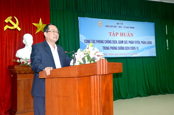 Phát biểu tại buổi tập huấn, PSG.TS Hồ Văn Hoàng-Viện trưởng Viện Sốt rét-KST-CT Quy Nhơn nhấn mạnh thêm về tình hình, diễn biến mới nhất hiện nay của đại dịch do vi rus SARRS-CoV-2 gây ra trên toàn thế giới và Việt Nam và tầm quan trọng của việc tổ chức lớp tập huấnvới những nội dung quan trọng theo Quyết định số 5188 QĐ/BYT. Các công tác phân luồng, tiếp nhận, sàng lọc và cách ly người nhiễm hoặc nghi ngờ nhiễm SARS -Cov-2 và xây dựng các phương án, quy trình sàng lọc, tiếp đón, xử trí người bệnh khám chữa bệnh tại Viện khi có nghi ngờ bệnh nhân nhiễm SARS-CoV-2 là hết sức cần thiết.