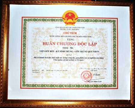 Năm 2011 Viện Sốt rét-Ký sinh trùng-Côn trùng Quy Nhơn được vinh dự đón nhận Huân chương độc lập hạng Nhì của Chủ tịch nước Công Hòa Xã Hội Chủ Nghĩa Việt Nam, đây là phần thưởng cao quý mà Đảng và Nhà nước dành cho cán bộ chuyên ngành sốt rét, ký sinh trùng khu vực miền Trung-Tây Nguyên về thành tích bảo vệ, chăm sóc và nâng cao sức khỏe nhân dân. Viện Sốt rét-Ký sinh trùng-Côn trùng Quy Nhơn đang chuẩn bị Lễ kỷ niệm 35 năm thành lập Viện và đón nhận Huân chương Độc lập hạng Nhì cùng với hoạt động chào mừng là “Hội thi kỹ thuật giỏi côn trùng” khu vực miền Trung-Tây Nguyên.