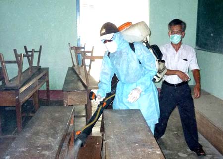 Phun thuốc phòng chống cúm gia cầm ở trường học tại Nha Trang. Ảnh: Nguyễn Nam Anh |