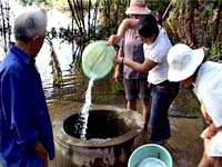Nếu giếng nước bị ngập lụt, có nước đục; phải tiến hành thau vét giếng. Múc cạn nước và vét hết bùn cặn. Các vùng có điện hoặc có máy nổ, dùng máy bơm điện hút cạn nước rồi thau vét giếng. Trong trường hợp không thau vét được, nên chọn một giếng nước khác để xử lý và dùng chung. Nếu tất cả các giếng nước trong khu vực đều không thể thau vét được, có thể áp dụng biện pháp xử lý tạm thời như múc vài chục lít nước lên bể chứa rồi đánh phèn chua và khử trùng. Sau đó có thể dùng tạm nguồn nước đã xử lý, khi dùng hết nước, thực hiện thêm các đợt khác để sử dụng; chờ vài ngày sau mức nước giếng xuống thấp sẽ tiến hành thau vét. Trường hợp không có phèn chua để làm trong nguồn nước, có thể làm một bể lọc cát tạm thời bằng một thùng, xô hay vại với thể tích chứa khoảng 20-30 lít nước. Đục một lỗ với đường kính chừng 1 cmtrên vách thành, cách đáy thùng 5 cm. Cho một ít đá hoặc gạch vỡ lót ở đáy, đặt một mảnh bao tải gai lên trên rồi đổ cát dày khoảng 25-30 cm. Đổ nước giếng vào cho đến khi nước chảy ra trong suốt thì lấy để khử trùng.