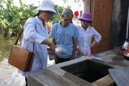 Cán bộ Trung tâm y tế dự phòng tỉnh, huyện đến từng nhà dân hướng dẫn xử lý nguồn nước bị ô nhiễm do ngập lụt Ảnh: Phạm Trường-QuangNinh online |