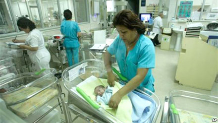 | Các điều dưỡng chăm sóc trẻ sơ sinh tại bệnh viện phụ sản ở Lima, Peru. |