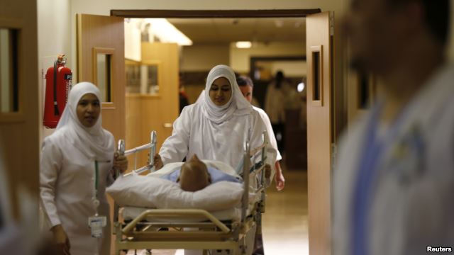 Điều dưỡng viên đang đẩymột bệnh nhân trong phòng cấp cứu tạiBệnh việnchuyên khoa Al-Noor ở Mecca, Saudi Arabia, ngày 30//2014 |