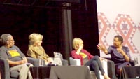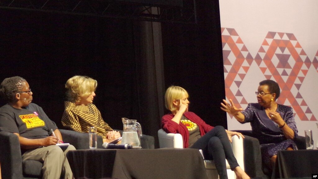 Graça Machel(bên phải), vợ cựu Tổng thống Nelson Mandela chỉ ra quyền của phụ nữ trẻ vị thành niên khi nữ diễn viên Charlize Theron quan tâm tới Hội nghị AIDS 2016 tại Durban, Nam Phi, ngày 19/7/2016.