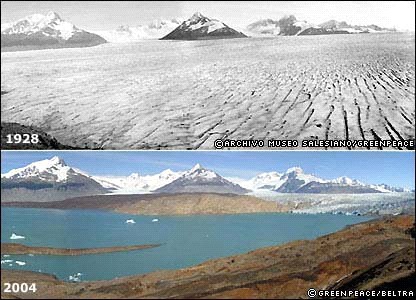 Bức tranh năm 1928 và năm 2004 biểu hiện rõ sự tan ra của băng tuyết do hiện tượng ấm lên toàn cầu. |