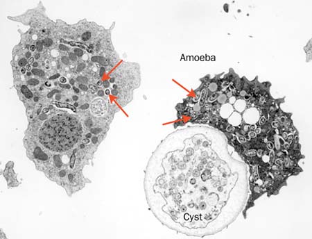 Phân tích mới đây đã tìm thấy bằng chứng về ô nhiễm lan rộng của các nguồn cung cấp nước với Amip, chẳng hạn như ba tế bào của ký sinh trùng Acanthamoeba. Mỗi tế bào chứa nhiều vi khuẩn (một số được hiển thị, mũi tên màu đỏ), có thể độc hại cho sức khỏe con người. Các vòng tròn ánh sáng là một u nang, một amip nghỉ ngơi bên trong một lớp vỏ bảo vệ rất chắc chắn.