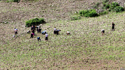 Nông dân Bắc Hàn trên một cánh đồng, dọc theo sông Yalu, tại quận Sakchu, tỉnh Bắc Phyongan,Bắc Triều Tiên, ngày 20/6/2015