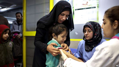 | Một bé gái Syria khóc thét sau khi tiêm vaccine sởi từ y tá Nadine Houjairi (người thứ hai bên phải) của UNICEF và Genivieve Bashalani (bên phải) tại trung tâm đăng ký của cơ quan tị nạn Liên Hiệp Quốc tại Zahleh, ở thung lũng Bekaa của Lebanon, ngày 18/12/2013 |
