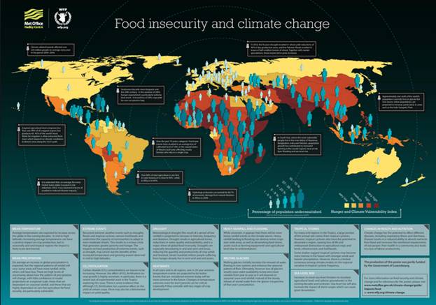 Trong số 26 vụ khủng hoảng lương thực đã được nêu ra, có 13 vụ bị ảnh hưởng bởi thiên tai. Một số nước dễ bị hạn hán, lốc xoáy, bão và lũ lụt có xu hướng thu hoạch thấp do hộ nông thôn nghèo tiếp cận với đầu vào nông nghiệp hạn chế như tưới tiêu, phân bón và cải thiện hạt giống hoặc tín dụng, và họ thiếu khả năng giảm thiểu tác động của những điều kiện thời tiết thay đổi liên tục.