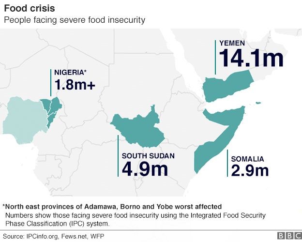 Trong năm 2017, giá lương thực đạt mức cao kỷ lục ở Nigeria, Niger, Ethiopia, Kenya, Uganda, Sudan, Yemen và Nam Sudan và ở mức cao bất thường ở nhiều quốc gia, bao gồm Bangladesh, Burundi, Somalia và Sri Lanka. Mức tăng giá cao ảnh hưởng không cân xứng đến các hộ gia đình nghèo, do chi tiêu lương thực cao, thường vượt quá 65% ngân sách của họ.