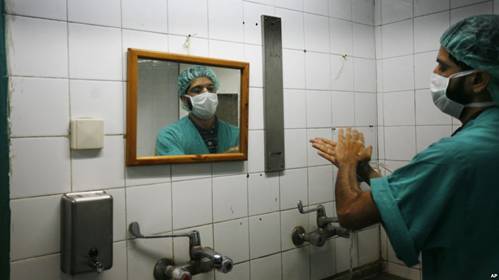 Một bác sĩ Palestine rửa tay trước khi thực hiện phẫu thuật tại bệnh viện Shifa,Tp. Gaza, ngày 27/1/2009. Các quan chức y tế cho rằng rửa tay là biện pháp quan trọng nhất ngăn ngừa nhiễm trùng vết mổ