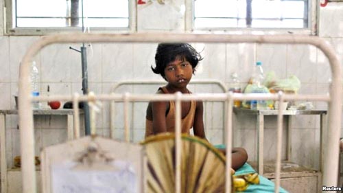 Một bé gáibị ốm sau khi ăn bữa ăn bị ô nhiễm cho trẻ em tại một trường học vào ngày thứ ba, nằm bên trong một bệnh viện ở thành phố Patna phía đông của Ấn Độ, 18/7/2013